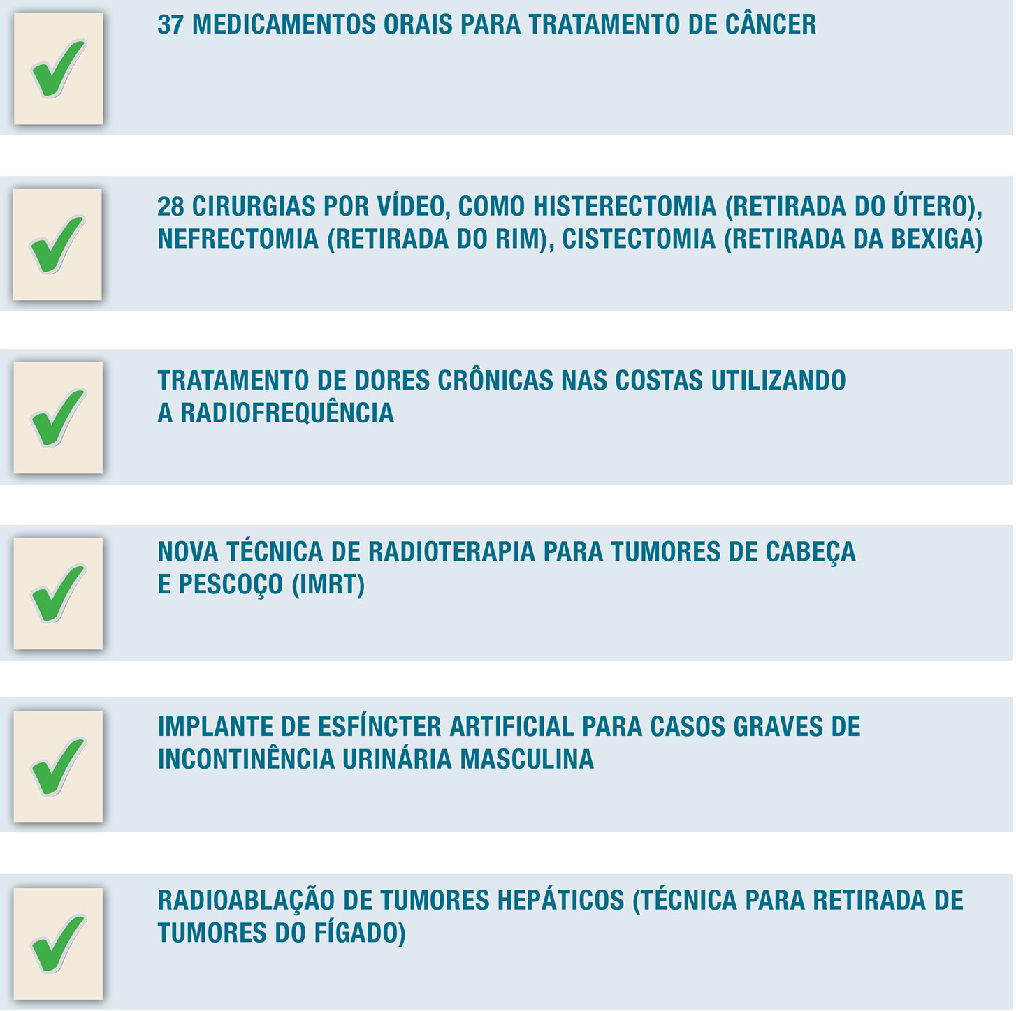 Passam a ser ofertados medicamentos para o tratamento de tumores de grande prevalência entre e população, como estômago, fígado, intestino, rim, testículo, mama, útero e ovário. A terapia medicamentosa oral contra o câncer promove maior conforto ao paciente e reduz os casos de internação para tratamento em clínicas ou hospitais.