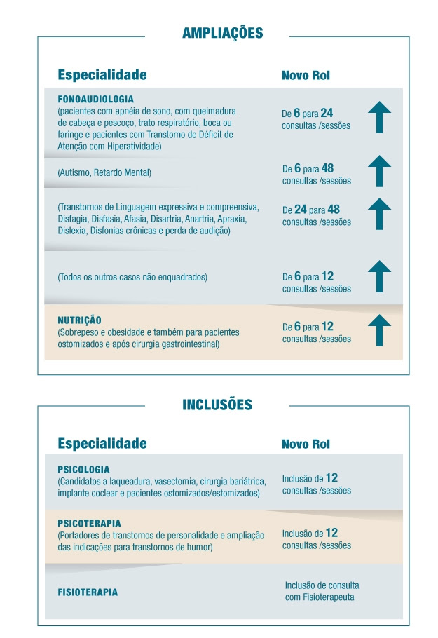 O novo rol também contempla o cuidado integral à saúde e o tratamento multidisciplinar ao prever na cobertura obrigatória consulta com fisioterapeuta, além de ampliar o número de consultas e sessões de seis para 12 com profissionais de especialidades como fonoaudiologia, nutrição, psicologia e terapia ocupacional. Pacientes, por exemplo, que queiram se submeter à laqueadura, vasectomia, cirurgia bariátrica, implante coclear e ostomizados ou estomizados têm direito a 12 sessões de psicologia.